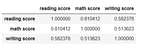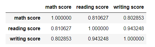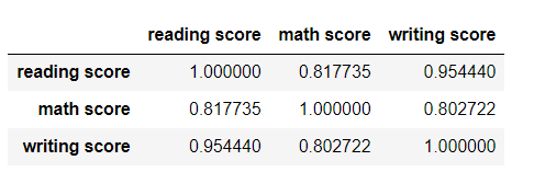 df[[ 'math score', 'reading score', 'writing score']].corr()