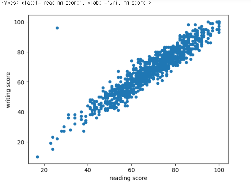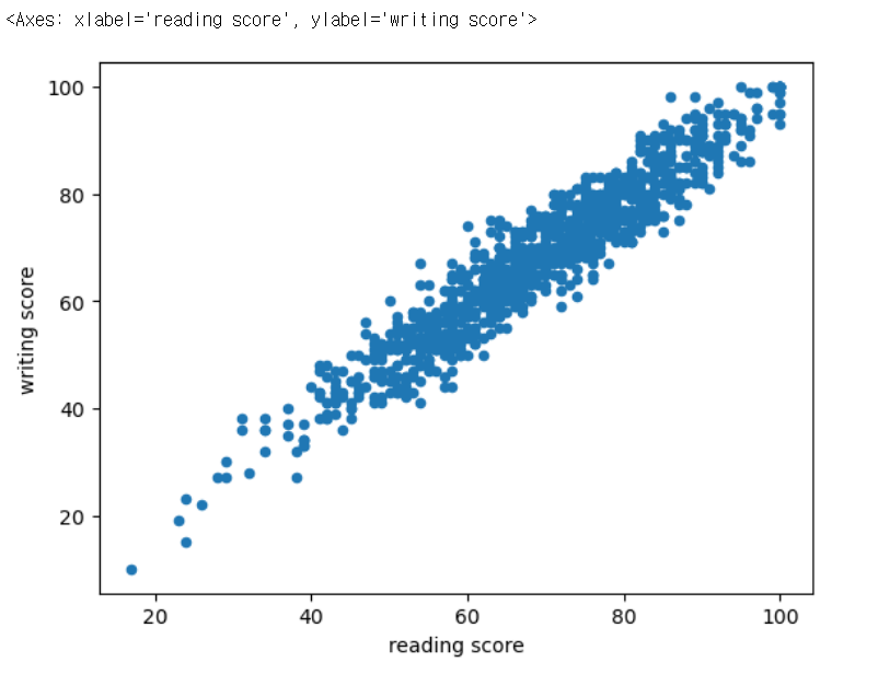 df.plot(kind='scatter', x='reading score', y='writing score')