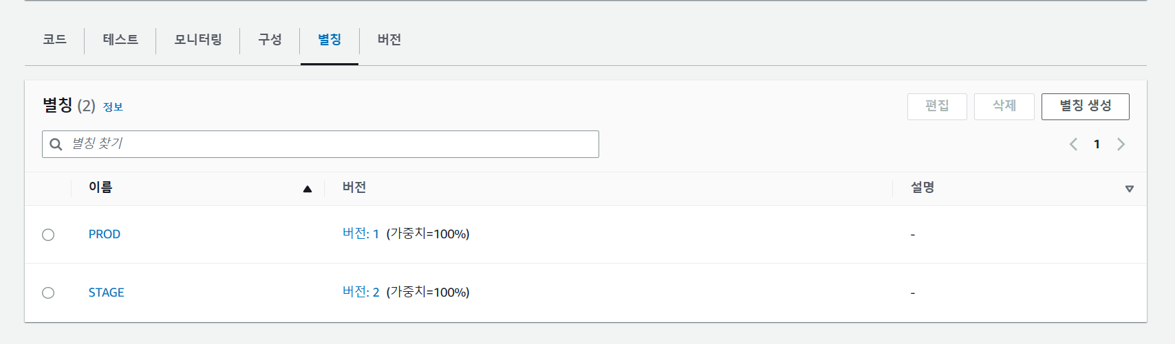※ 버전 2도 마찬가지로 별칭을 STAGE로 생성한다.