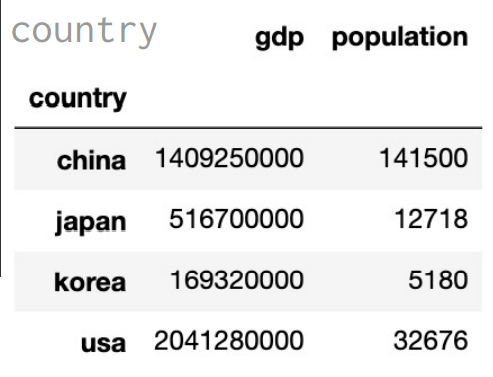 print(country.index) # Index(['china', 'japan', 'korea', 'usa'], dtype='object', name='Country’)