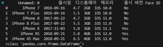데이터 row 값 추가 iphone_df.loc['iPhone XR'] = ['2018-01-25', 6.1, '3GB', 'ios 12.0.1', 'Yes'] print(iphone_df, end='\n\n') 데이터 column 추가 iphone_df['제조사'] = 'Apple' print(iphone_df, end='\n\n') 데이터 row 삭제 iphone_df.drop('iPhone XS', axis='index', inplace=False) # row 삭제 print(iphone_df, end='\n\n') - inplace=True인 경우 - inplace=False인 경우 -- 원본 데이터 안바뀜 데이터 column 삭제 iphone_df.drop('제조사', axis='columns'..